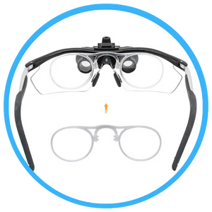 Aluminum loupes with an aluminum-magnesium alloy frame, equipped with internal lenses that adapt to different glasses according to the user's needs.